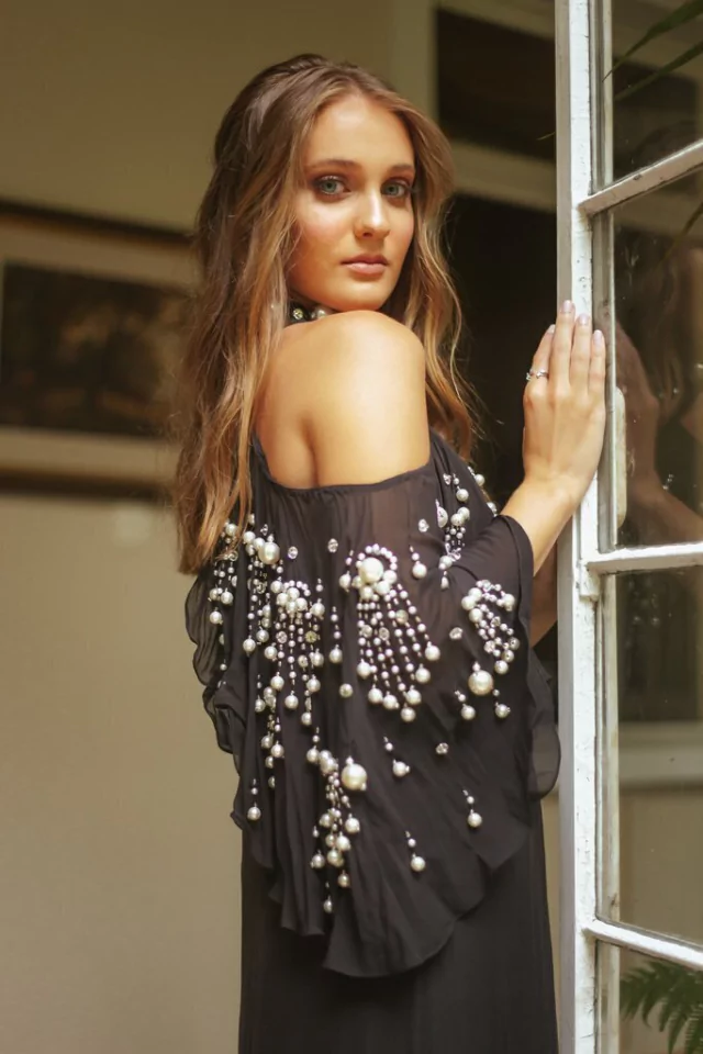 Vestido longo com destaque para bordado em pérolas e decote plissado com ombro à mostra.